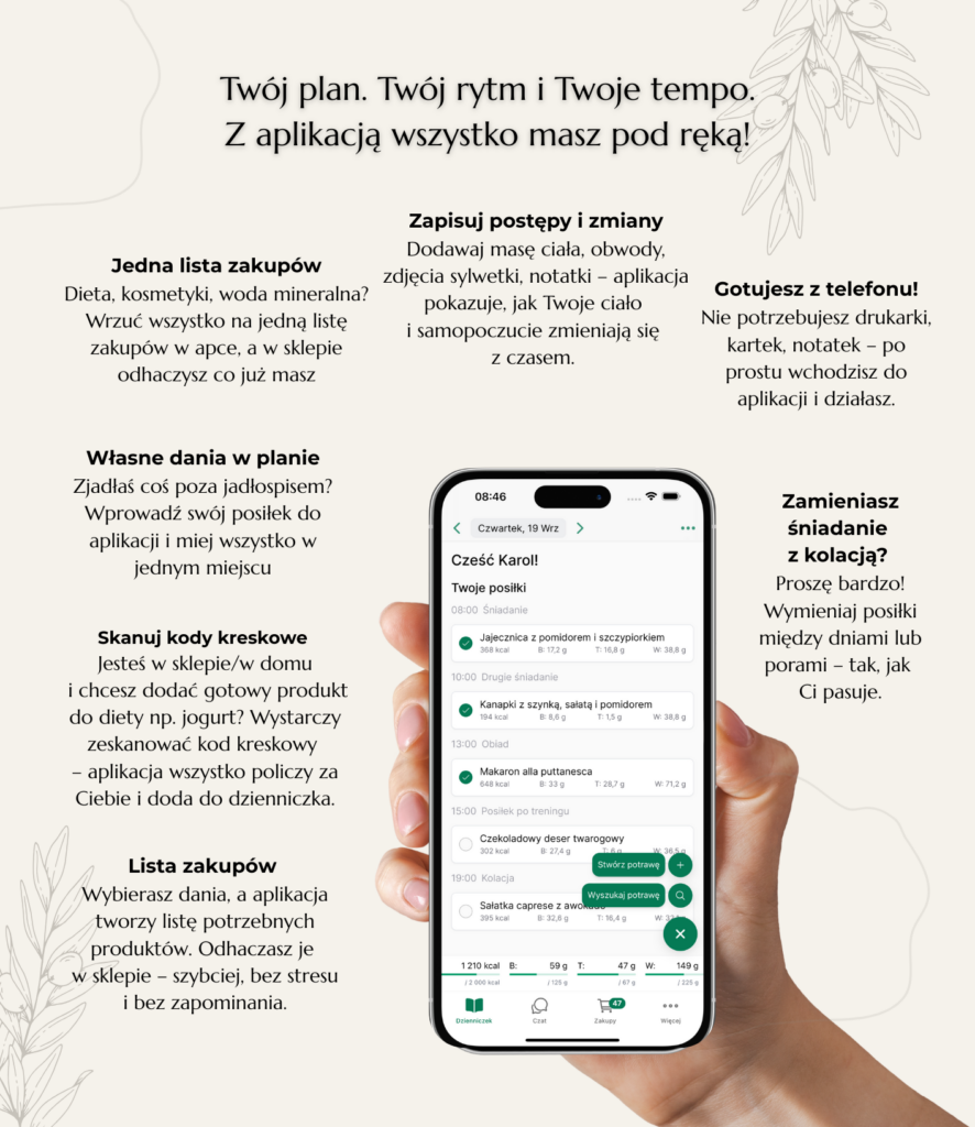 - Dostęp do aplikacji mobilnej na 3 miesiące – GRATIS! Planuj, wymieniaj posiłki, twórz listy zakupów i śledź swoje postępy – wszystko w jednym miejscu.